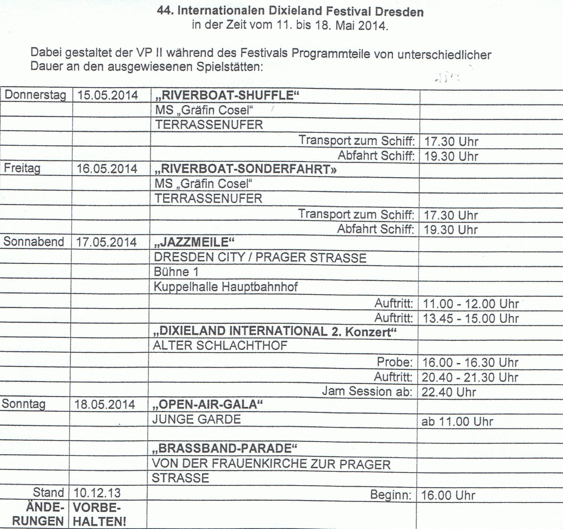 Zespół Leliwa Jazz Band został zaproszony do udziału w 44. INTERNATIONALES DIXIELAND FESTIVAL - DREZDEN, który odbędzie się w dn. 15 - 18 maja 2014 r. Jest to największy i chyba najpiękniejszy festiwal jazzu tradycyjnego w Europie. Z dużą przyjemnością odnotowujemy, że na festiwal wybiera się grupa fanów starego jazzu związana z TSJT"Leliwa". Jeśli jesteś zainteresowany - zarezerwuj bilety i hotel. Szczegóły na www.dixieland.de