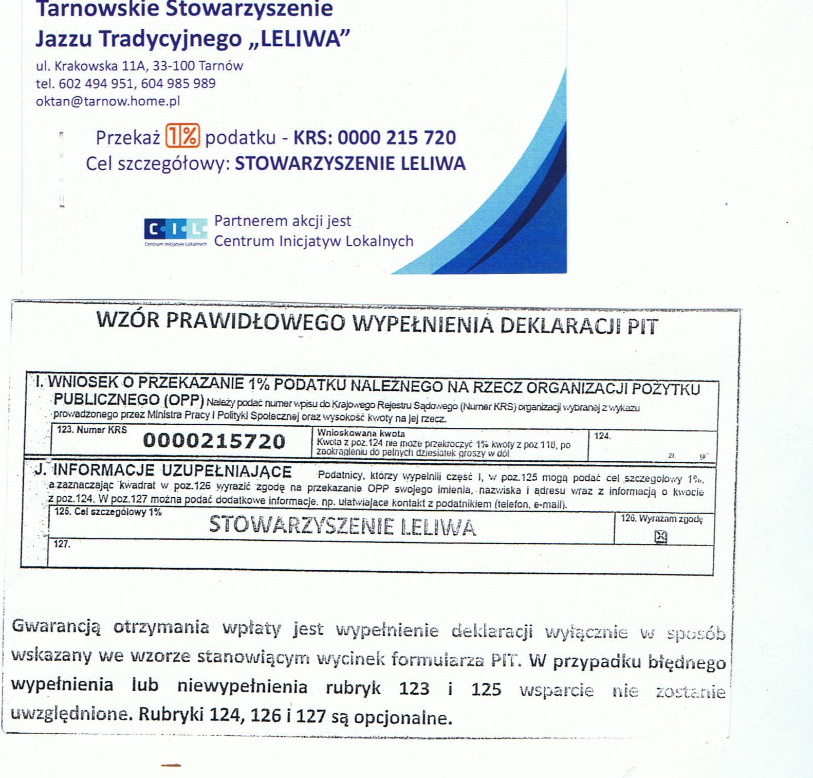 Jeśli chcesz osobiście wesprzeć zadania realizowane przez Tarnowskie Stowarzyszenie Jazzu Tradycyjnego "Leliwa" (letni festiwal i jazzowe czwartki) - możesz odprowadzić 1 % podatku wg poniższego wzoru: